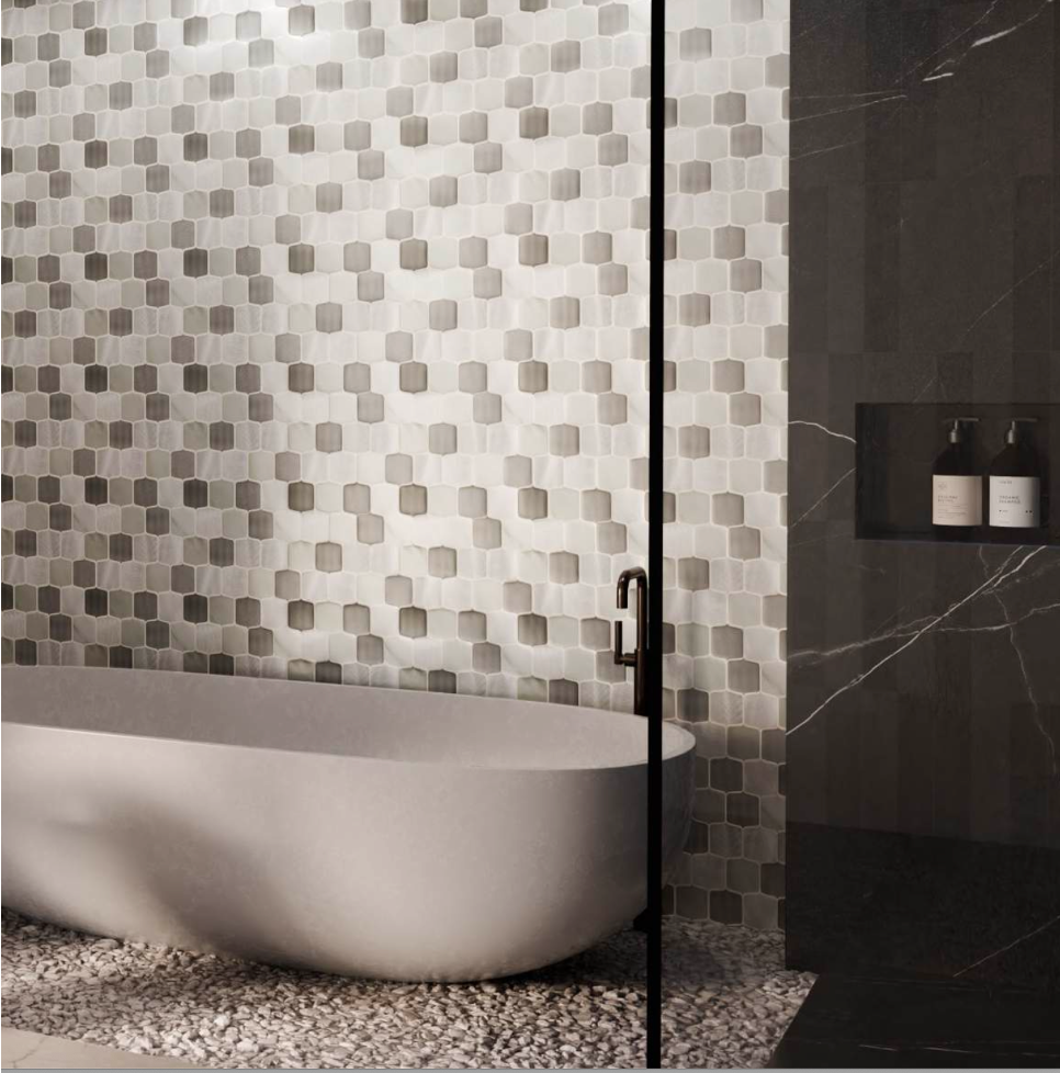 Tile aesthetically designed and inspired by the past with a modern sensibility that looks to the future. Vintage modern to organic modern designs - mosaics in dimensional stone, stone + metal and glass combinations